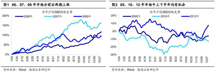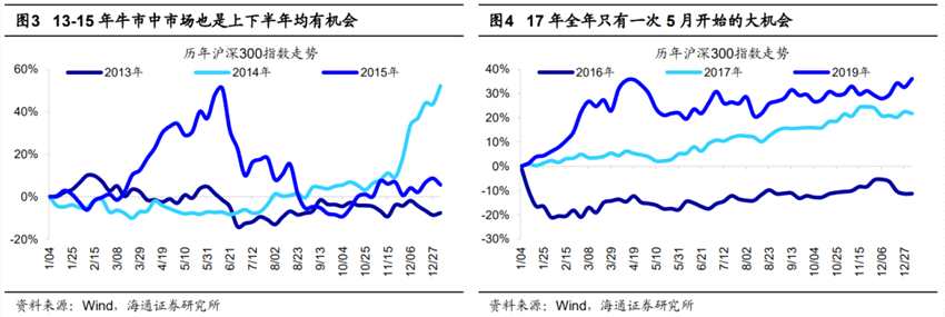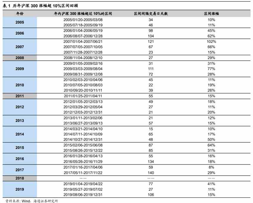 回顧歷史,一年通常兩波10%及以上的上漲行情。9月份以來市場成交逐漸低迷,考慮到海外疫情再度升溫,11月美國大選,年初至今A股已經(jīng)累積一定漲幅等因素,投資者觀望氛圍濃厚,而我們對四季度相對樂觀一些。從歷史經(jīng)驗來看,過去絕大多數(shù)年份中市場通常有兩波較大的行情。以滬深300為例,我們統(tǒng)計了2005-2019年每一年中指數(shù)最大漲幅超過10%,區(qū)間交易日超過20天的次數(shù),發(fā)現(xiàn)過去15年中,除了2008、2011、2018這三年單邊熊市,其他年份幾乎每年滬深300都有兩到三次20天以上+10%以上的漲幅,而且這兩到三次機(jī)會一般都是上下半年都有一兩次機(jī)會。如2019年有三次大的行情,分別分布在上半年,年中和下半年:上半年的機(jī)會在1-4月,期間滬深300指數(shù)區(qū)間最大漲幅超過40%,天數(shù)超過80個交易日;年中的機(jī)會在5-7月,指數(shù)最大漲幅約為10%,持續(xù)約30天;下半年的機(jī)會從8月初開始,至年底指數(shù)最大漲幅約為15%,持續(xù)超過100天。唯一的例外是2017年:這一年其實從時間上看有兩次行情,一次是年初到4月的躁動行情,另一次是5-11月的藍(lán)籌行情,只是17年躁動行情指數(shù)最大漲幅只有8%,幅度略小。相比之下,熊市雖然也會有反彈,但是從統(tǒng)計角度看符合“20天以上+10%以上”的漲幅標(biāo)準(zhǔn)的一年頂多就一次。如08年在全年下跌后,四萬億出臺帶來了年底的行情,11年初春季躁動后全年持續(xù)走低,18年則全年都沒有明顯的機(jī)會。因此歷史經(jīng)驗告訴我們,正常情況下一年通常有兩波較大的行情可以參與。視角再放回當(dāng)下,今年滬深300指數(shù)最大的行情在3-7月,期間指數(shù)最大漲幅接近40%。由于今年的行情肯定不屬于單邊下降的熊市,因此根據(jù)歷史上一年2次大行情的規(guī)律,今年滬深300指數(shù)還有望出現(xiàn)第二次行情,Q4仍行情仍可期。