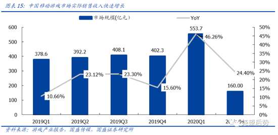 疫情帶動線上游戲活躍度大幅提升。一季度受疫情的影響,居家隔離使得用戶將更多的娛樂時間轉(zhuǎn)向線上,游戲業(yè)務(wù)板塊活躍用戶大幅增加,流水也有較大提升。數(shù)據(jù)顯示,2020年一季度和2020年4月,中國移動游戲市場規(guī)模分別達到553.7億元和160億元,同比增速分別為46.26%和24.4%,較2019年的增速繼續(xù)提升。