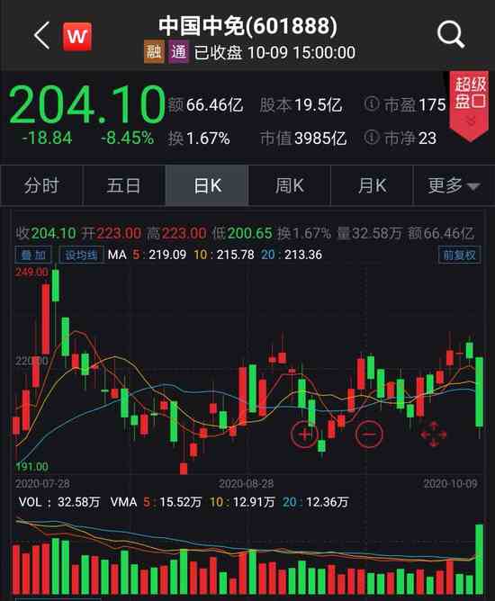 行情數(shù)據(jù)顯示,10月9日開盤后不久中國中免股價即開始閃崩,很快一度觸及跌停。截至發(fā)稿,中國中免跌8.45%,報204.1元/股,市值仍超過3900億元。