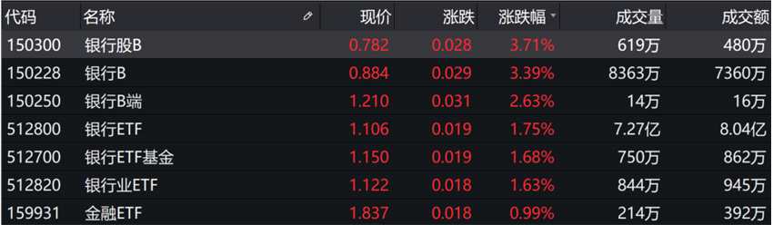 今日,銀行板塊表現(xiàn)較為強(qiáng)勢(shì),申萬(wàn)銀行行業(yè)以1.70%的漲幅位居申萬(wàn)一級(jí)行業(yè)漲幅榜首位。場(chǎng)內(nèi)銀行主題基金悉數(shù)飄紅,其中,銀行股B(150300.SZ)、銀行B(150228.SZ)漲幅超過(guò)3%,銀行B端(150250.SZ)漲幅超過(guò)2%。