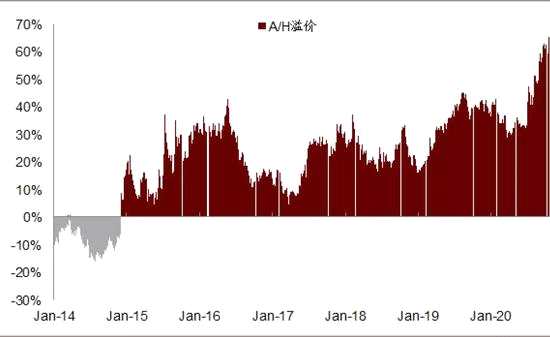 圖表: A/H溢價(jià)程度也屢創(chuàng)歷史新高,A股銀行標(biāo)的整體股價(jià)與對(duì)應(yīng)的H股相比溢價(jià)達(dá)到60%
