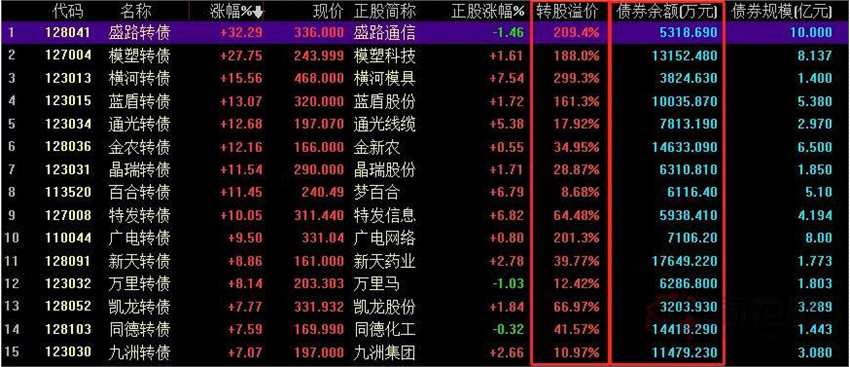 從20日漲幅前十五的轉(zhuǎn)債來(lái)看,多只轉(zhuǎn)債都在300元以上。債券剩余規(guī)模也都集中在1億元左右,其中,漲幅第一的盛路轉(zhuǎn)債剩余規(guī)模僅5000多億。轉(zhuǎn)股溢價(jià)率方面,15只轉(zhuǎn)債中有多只高于50%,最高的橫河轉(zhuǎn)債達(dá)到近300%的溢價(jià)率。