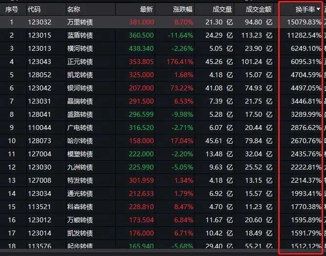作為T+0的可轉(zhuǎn)債,資金炒作瘋狂起來,太嚇人,從換手率來看,萬里轉(zhuǎn)債、藍(lán)盾轉(zhuǎn)債的換手率已經(jīng)超過100倍,其中萬里轉(zhuǎn)債高達(dá)151倍。