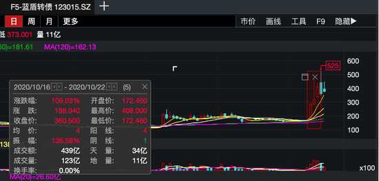 漲幅最驚人的當(dāng)屬藍(lán)盾轉(zhuǎn)債,從上周五(10月16日)開(kāi)始,截至10月22日,短短5個(gè)交易日,藍(lán)盾轉(zhuǎn)債累計(jì)漲幅近188%,成交額439億,成交量123億。