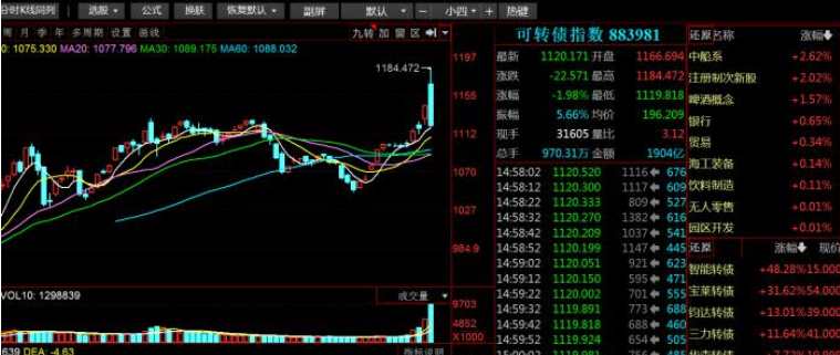 可轉(zhuǎn)債市場昨日成交剛剛歷史首次突破千億元,今日(10月23日)半日成交就再超千億,下午成交量繼續(xù)擴(kuò)大,全日成交量逼近2000億。板塊指數(shù)今日也觸及1184.5點的歷史高點。不過,午后隨著大盤跳水,可轉(zhuǎn)債籌碼也出現(xiàn)松動,下午出現(xiàn)跳水走勢,截至收盤,下跌1.98%,報1120.2點,全天振幅高達(dá)5.66%。