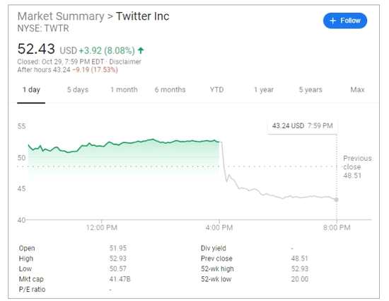 Twitter周四收盤時漲逾8%至52.43美元,創(chuàng)2015年4月以來新高。財報公布后股價盤后跳水17.53%,至43.24美元。