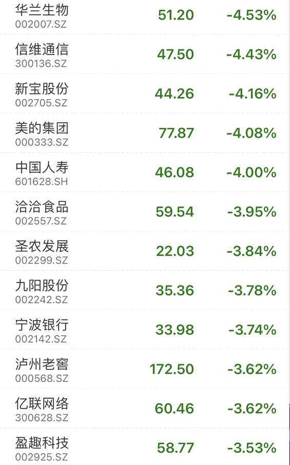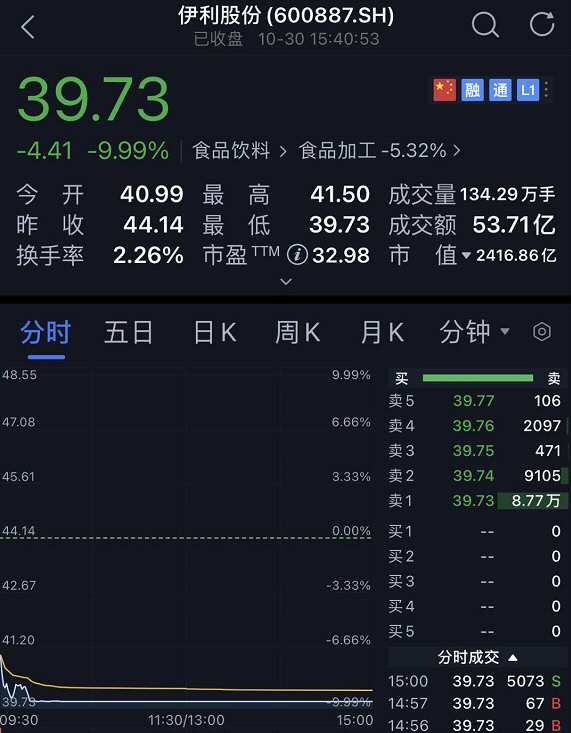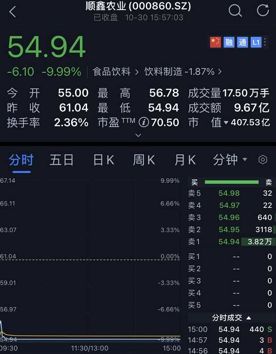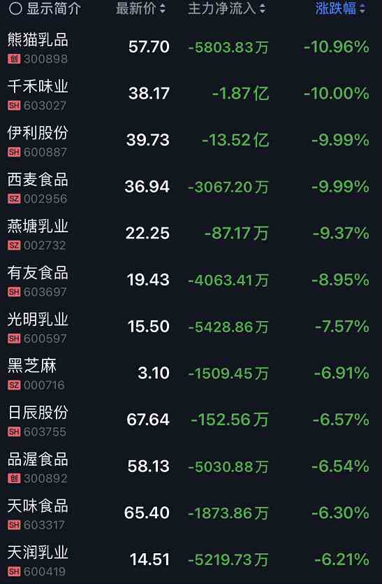 另外,由于伊利股份(600887)和順鑫農(nóng)業(yè)(000860)三季報不及預(yù)期而放量跌停,直接帶動食品飲料板塊領(lǐng)跌兩市。【熊貓乳品(300898)、股吧】(300898)、千禾味業(yè)(603027)、西麥?zhǔn)称罚?02956)等跌?;虻?0%。