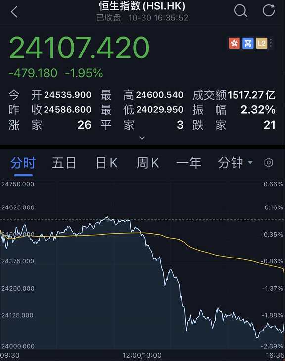 港股方面,恒生指數(shù)低開0.21%,午后跌幅擴(kuò)大。截至收盤,恒生指數(shù)跌1.95%,報24107.42點(diǎn);國企指數(shù)跌1.96%,紅籌指數(shù)跌1.59%。美團(tuán)跌3.03%,阿里巴巴跌3.11%,騰訊控股跌2.31%。