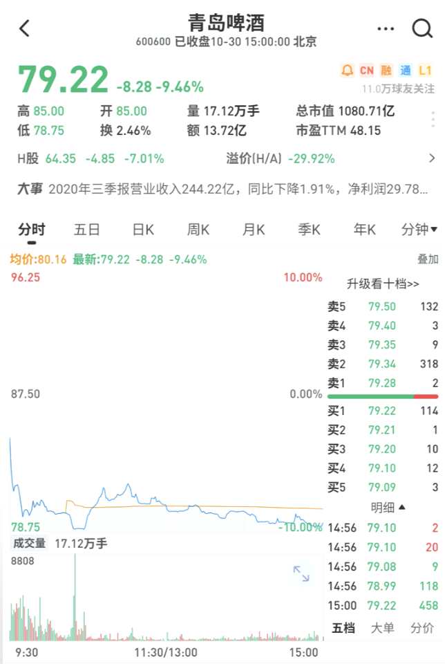 青島啤酒同樣受累于表現(xiàn)不佳的三季報,盤中一度跌停,總市值跌落1000億以下。財報顯示,今年前三季度青島啤酒實現(xiàn)營收244.22億元,同比下降1.91%;凈利潤29.78億元,同比增長15.17%。對于營收的下降,青島啤酒解釋稱,主要原因是受新冠疫情影響報告期內(nèi)公司主營產(chǎn)品銷量下降,使得營業(yè)收入同比減少所致。