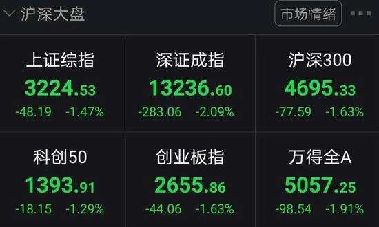截至收盤,上證指數(shù)跌1.47%,報3224.53點;深證成指跌2.09%,報13236.60點;創(chuàng)業(yè)板跌1.63%,報2655.86點。滬指、深指均創(chuàng)下一個月來最大日跌幅。
