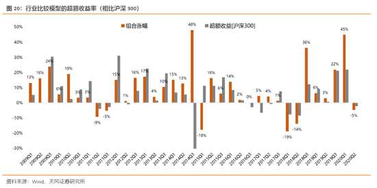 2009年至今,行業(yè)組合的累計收益率為1407%,年化收益率為26.6%;相比滬深300的年化超額收益率為21.7%,勝率為71.4%。上一期(2020Q2,持有期09.01-10.31日)組合收益率為-4.7%,相比滬深300超額收益率-2.2%。