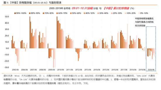 另外,從全市場所有個股一季報、中報、三季報的盈利指標(biāo)與各自的持有期漲幅的關(guān)系,也可看出中報個股盈利增速與中報持有期漲幅之間的單調(diào)相關(guān)性,要比一季報和三季報來得弱一些。其中,一季報、中報、三季報的持有期分別為5.1日-8.31日、9.1日-10.31日,11.1日-次年4.30日。比如,2020年中報這期,持有期(09.01-10.31)的漲幅大小與中報增速高低,表現(xiàn)出的線性關(guān)系就相對較弱。