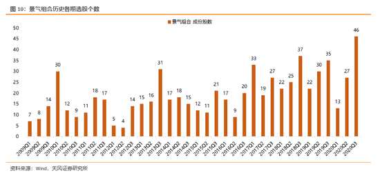 相似地,20年10月,漲幅最高的行業(yè)是汽車、家電、電氣設(shè)備、銀行、食品飲料,背后也有日歷效應(yīng)的邏輯,往前看,以景氣趨勢為核心進行配置,仍是勝率最高的方向。建議重點關(guān)注我們的三季報組合。
