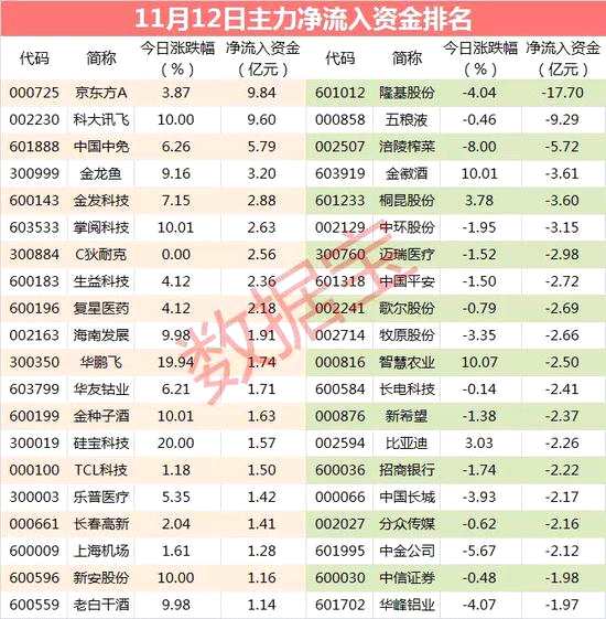 京東方A全天凈流入資金居首
