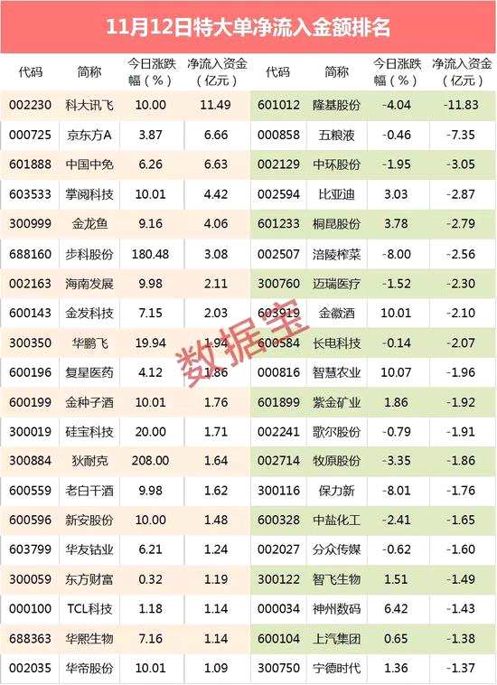 今日僅有20股大單資金流入超億元。科大訊飛大單資金流入居首,凈流入11.49億元,股價(jià)漲停,最新市值再度逼近千億。10月26日公司發(fā)布三季財(cái)報(bào)后,股價(jià)強(qiáng)勁反彈,區(qū)間漲幅已達(dá)26%。三季報(bào)顯示,科大訊飛前三季度營收72.8億元,同比增長(zhǎng)10.8%;凈利潤5.5億,同比增長(zhǎng)48.4%。值得關(guān)注是,在科大訊飛發(fā)布財(cái)報(bào)后,北上資金持續(xù)買入,相對(duì)8月26日持倉8000余萬股,最新持倉已經(jīng)達(dá)到1.24億股,13個(gè)交易日加倉4400多萬股,以區(qū)間平均價(jià)39.28元計(jì)算,加倉市值達(dá)到17億元。盤后龍虎榜顯示,北上資金今日再度凈買入1億元。科大訊飛一直受私募大佬葛衛(wèi)東青睞,其從2017年四季度開始買入,之后多次加碼增持,潛伏近3年,最新持股5100多萬股,持倉市值超22億元。