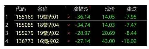 除此之外,紫光債昨天也大跌,之前有個(gè)品牌叫做清華紫光,所以紫光相當(dāng)于清華下面的校辦企業(yè),北大方正和清華紫光都屬于一個(gè)性質(zhì)的,所以看見方正那邊違約了,紫光這邊就也想賴賬了,紫光債,也是100面值,連續(xù)下跌之后,現(xiàn)在也只有十幾塊錢,帶動(dòng)著清華控股存續(xù)債都跟著大跌,市場(chǎng)消息說(shuō)紫光已經(jīng)對(duì)到期的10億信托貸款申請(qǐng)延期兩年,說(shuō)白了就是還不上了。
