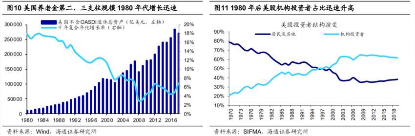 美股1980年后的轉(zhuǎn)變?cè)醋詸C(jī)構(gòu)投資者占比上升。美股在1980年代經(jīng)歷了從小牛熊周期到長(zhǎng)牛的轉(zhuǎn)變,我們認(rèn)為背后的原因是1980年前后啟動(dòng)的養(yǎng)老金入市政策。首先是1980年前后美國(guó)做大了養(yǎng)老金規(guī)模:1974 年美國(guó)通過(guò)《雇員退休收入保障法案》(即 ERISA 法案),個(gè)人退休金賬戶(即 IRAs 計(jì)劃)得以誕生;1978年《美國(guó)國(guó)內(nèi)稅收法案》中的401K條款規(guī)定貢獻(xiàn)確定型養(yǎng)老金享受稅收遞延或優(yōu)惠;IRAs 和 401(K)的推出使得美國(guó)養(yǎng)老金規(guī)??焖偕仙?,1980年代美國(guó)養(yǎng)老金第二三支柱總規(guī)模十年復(fù)合年化增長(zhǎng)率在15%以上。其次是美國(guó)養(yǎng)老金入市的比例也在上升:以IRAs計(jì)劃為例,1980年后該計(jì)劃對(duì)共同基金的配置比例從1980年的3%上升到2000年的48%,證券及其他資產(chǎn)的比例從5%上升到35%。大量養(yǎng)老金在1980年代穩(wěn)步入場(chǎng)推動(dòng)著股市進(jìn)入長(zhǎng)牛。與此同時(shí),養(yǎng)老金持有者往往委托機(jī)構(gòu)投資者代為理財(cái),在養(yǎng)老金規(guī)模做大后,機(jī)構(gòu)投資者在股市中的占比也從1980年初的40%逐漸提高至2000年前后的60%,整體股市的投資氛圍更為理性成熟,股市的波動(dòng)也有所收斂。