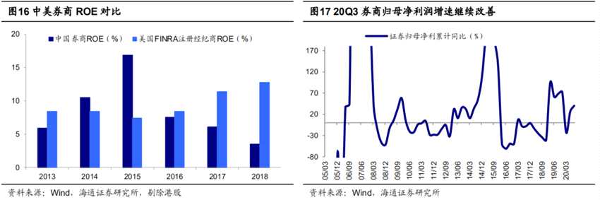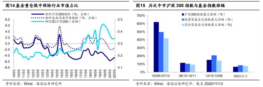 中短期后周期,中長(zhǎng)期轉(zhuǎn)型升級(jí)。中長(zhǎng)期視角看,“十四五”正式開啟向第二個(gè)百年目標(biāo)奮斗新征程,將以推動(dòng)經(jīng)濟(jì)高質(zhì)量發(fā)展為主題,努力構(gòu)建“雙循環(huán)”新發(fā)展格局,建議稿中特別突出了創(chuàng)新驅(qū)動(dòng)和科技自立自強(qiáng)重要地位,對(duì)建議稿分析詳見我們前期報(bào)告《<建議>出爐,擎繪藍(lán)圖—十四五系列2-20201105》。我們認(rèn)為,本輪牛市是轉(zhuǎn)型升級(jí)牛,主線是科技,類似1980-2000年的美股,產(chǎn)業(yè)結(jié)構(gòu)升級(jí)是核心。展望未來(lái)一年到一年半,即這輪牛市的終點(diǎn),更多有關(guān)科技行業(yè)的政策紅利和技術(shù)紅利將釋放,科技仍是主線,基本面向好將有力支撐科技股行情,如新能源產(chǎn)業(yè)鏈、計(jì)算機(jī)、傳媒等。中短期應(yīng)關(guān)注順周期,目前A股正處在風(fēng)格階段性再平衡階段,行情有望從早周期向后周期板塊蔓延,即大金融,其中我們首推券商。短期看,當(dāng)前市場(chǎng)已進(jìn)入本輪牛市3浪上漲階段,成交量放大將推高券商業(yè)績(jī),20Q3券商歸母凈利潤(rùn)累計(jì)同比高達(dá)40%,但今年以來(lái)申萬(wàn)券商行業(yè)漲幅只有8%。今年10月份以來(lái)日均成交額已達(dá)7800億元,而去年四季度僅4500億左右,所以今年下半年券商利潤(rùn)有望實(shí)現(xiàn)高增長(zhǎng)。中期看,金改將改變?nèi)虡I(yè)態(tài),當(dāng)前中國(guó)產(chǎn)業(yè)結(jié)構(gòu)升級(jí)目標(biāo)類似美國(guó),即大力發(fā)展科技產(chǎn)業(yè),融資結(jié)構(gòu)也將對(duì)標(biāo),然而美國(guó)券商ROE13%、中國(guó)僅6%,我們認(rèn)為金改最終將提高券商ROE。20Q3基金重倉(cāng)股中券商股持有市值占比為1%,相比滬深300(自由流通市值)低配8.1(4.3)個(gè)百分點(diǎn)。