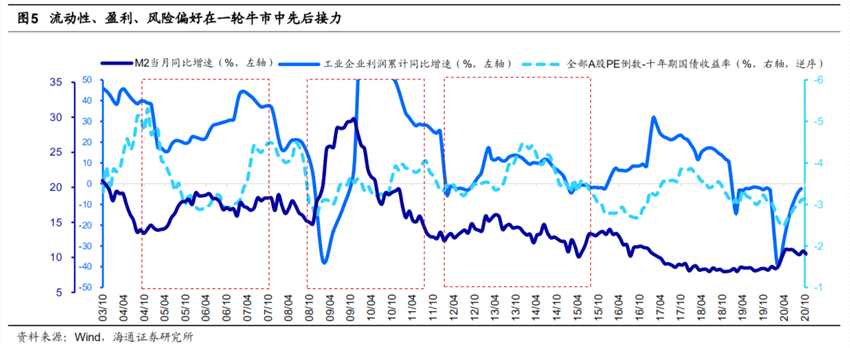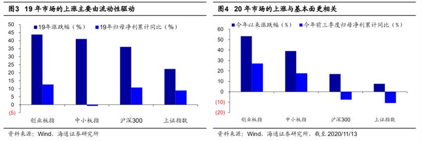 牛市處在三級(jí)火箭第二級(jí),信用債違約不改牛市格局。我們?cè)凇杜J杏腥齻€(gè)階段-20190303》等報(bào)告中將牛市基于資金面、基本面、情緒面進(jìn)一步細(xì)化為孕育期、爆發(fā)期、泡沫期三個(gè)階段:牛市孕育期時(shí),基本面尚未從衰退中走出來(lái),但是政策已經(jīng)開始加碼托底經(jīng)濟(jì),宏觀流動(dòng)性寬松帶動(dòng)市場(chǎng)上行;牛市爆發(fā)期時(shí),前期政策效果開始顯現(xiàn),基本面也開始復(fù)蘇,政策維持寬松+基本面上行推動(dòng)A股盈利估值戴維斯雙擊;牛市泡沫期,宏觀政策在確認(rèn)基本面見底回升后開始退出,流動(dòng)性開始收緊,但基本面復(fù)蘇及其帶來(lái)的樂觀情緒推動(dòng)市場(chǎng)走向泡沫化。我們認(rèn)為2019年整體處在由流動(dòng)性驅(qū)動(dòng)的牛市孕育期,市場(chǎng)上漲與盈利的相關(guān)性并不大,比如創(chuàng)業(yè)板指與中小板指成分股去年的歸母凈利潤(rùn)同比增速分別為13%和-1%,但是指數(shù)的漲幅均超過(guò)了40%,指數(shù)漲幅與基本面的關(guān)系很弱,而且指數(shù)漲幅遠(yuǎn)超過(guò)基本面的改善。但是今年市場(chǎng)進(jìn)入了基本面和資金面雙輪驅(qū)動(dòng)的牛市爆發(fā)期,各大指數(shù)的漲跌幅差異與基本面差異基本一一對(duì)應(yīng):創(chuàng)業(yè)板指、滬深300與上證綜指成分股20Q3歸母凈利潤(rùn)累計(jì)同比增幅依次為27%、-8%、-11%,指數(shù)的漲幅也是依次遞減,年初至今(截至2020/11/13)分別漲50%、17%和8%。展望明年,隨著宏觀經(jīng)濟(jì)復(fù)蘇至正常水平,宏觀政策也將逐步調(diào)整,牛市也將從今年的爆發(fā)期轉(zhuǎn)變?yōu)槊髂暧苫久婧颓榫w驅(qū)動(dòng)的泡沫期,短期的信用違約并不會(huì)破壞中期牛市的邏輯。
