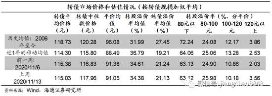 轉(zhuǎn)股溢價(jià)率有所壓縮。截至11月13日,全市場(chǎng)的轉(zhuǎn)股溢價(jià)率均值34.38%,環(huán)比下降0.23百分點(diǎn);純債溢價(jià)率均值21.13%,環(huán)比下降0.11個(gè)百分點(diǎn)。其中平價(jià)80元以下、80-100元、100-120元、120元以上轉(zhuǎn)債的轉(zhuǎn)股溢價(jià)率均值63.12%、25.98%、10.18%、3.56%,環(huán)比分別變動(dòng)-0.01、+1.09、-0.68、+1.53個(gè)百分點(diǎn)。