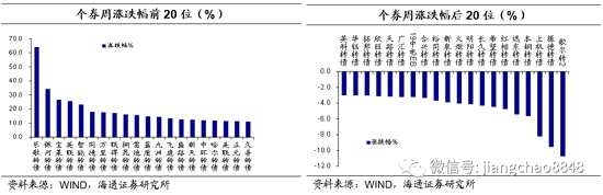 轉(zhuǎn)債指數(shù)下跌。上周中證轉(zhuǎn)債指數(shù)下跌0.35%,同期滬深300指數(shù)下跌0.59%、創(chuàng)業(yè)板指下跌0.96%、上證50下跌0.62%。周日均成交量(包含EB)429.21億元,環(huán)比下降3.15%,我們計(jì)算的轉(zhuǎn)債全樣本指數(shù)(包含公募EB)下跌0.38%。個(gè)券164漲3平162跌,正股139漲11平179跌。個(gè)券漲幅前5位分別是樂(lè)歌轉(zhuǎn)債(64.10%)、銀河轉(zhuǎn)債(34.33%)、寶萊轉(zhuǎn)債(26.58%)、英聯(lián)轉(zhuǎn)債(25.61%)、智能轉(zhuǎn)債(23.28%)。