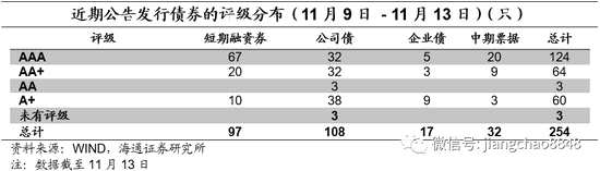信用債等級(jí)利差分化。具體來(lái)看,截至11月13日,1年期短期品種AA級(jí)與AAA級(jí)中票利差為29BP,較上周末上行3BP;3年期AA級(jí)與AAA級(jí)中票利差為33BP,較上周末下行1BP;5年期AA級(jí)與AAA級(jí)中票利差為56BP,較上周末上行1BP。