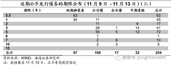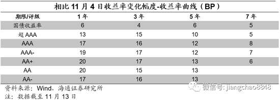 信用債期限利差收窄。具體來(lái)看,截至11月13日,5年期和3年期的AAA中票期限利差為27BP,較上周末下行4BP;5年期和3年期的AA中票期限利差為50BP,較上周末下行2BP;5年期和1年期AAA中票的期限利差為64BP,較上周末下行5BP。