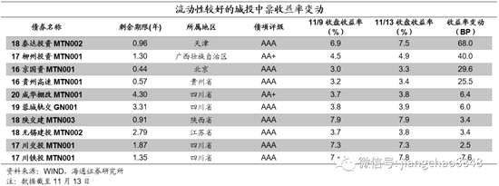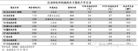 在我們觀測(cè)的樣本中,本周交易活躍的城投企業(yè)債收益率上行為主。具體來(lái)看,16昆東旭項(xiàng)目NPB上行43BP,14準(zhǔn)國(guó)資債上行35.9BP,17巴州國(guó)源債上行35.7BP,14晉城城投債上行13BP,18贛和濟(jì)小微債01上行5.1BP,19埇橋城投債上行4.4BP,17武漢高科債01下行0.3BP,17襄投債下行0.9BP,19龍嶺建投債下行7.5BP,17句容城投債02下行16.1BP。