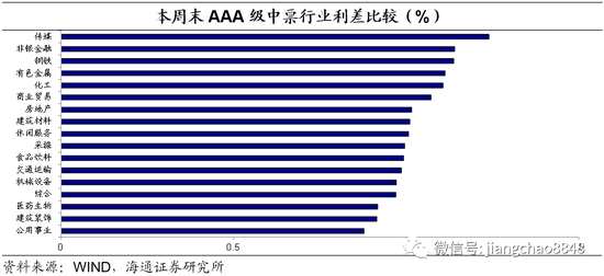高等級(jí)債中,傳媒、非銀金融是利差最高的兩個(gè)行業(yè)。AAA級(jí)傳媒行業(yè)中票平均利差為124BP,AAA級(jí)非銀金融行業(yè)中票平均利差為114BP。其次是鋼鐵、有色金屬、化工和商業(yè)貿(mào)易行業(yè),其利差均在110BP左右。公用事業(yè)是平均利差最低的行業(yè),目前為88BP。
