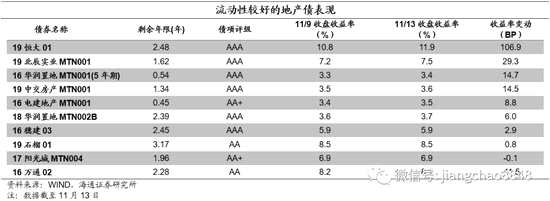 本周我們觀察的地產(chǎn)債樣本中,代表性債券的收益率上行為主。具體來(lái)看,19北辰實(shí)業(yè)MTN001上行29.3BP,16華潤(rùn)置地MTN001(5年期)上行14.7BP,19中交房產(chǎn)MTN001上行14.5BP,16電建地產(chǎn)MTN001上行8.8BP,18華潤(rùn)置地MTN002B上行6BP,16穗建03上行2.9BP,19石榴01上行0.8BP,17陽(yáng)光城MTN004下行0.1BP,16萬(wàn)通02下行11.5BP。