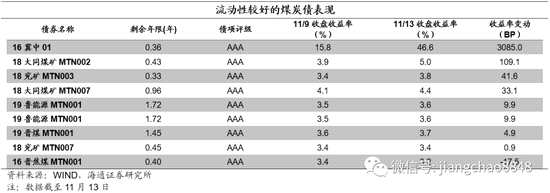本周我們觀測(cè)的煤炭債樣本中,代表性債券的收益率上行為主。具體來(lái)看,由于永煤違約,18永煤MTN001收益率大幅上行,另外16冀中01上行3085BP,18大同煤礦MTN002上行109.1BP,18兗礦MTN003上行41.6BP,18大同煤礦MTN007上行33.1BP,19魯能源MTN001上行9.9BP,19魯能源MTN001上行9.9BP,19晉煤MTN001上行4.9BP,18兗礦MTN007上行0.9BP,16晉焦煤MTN001下行17.5BP。