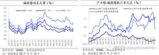 產(chǎn)業(yè)債與城投債利差基本持平,AA+級(jí)信用債中城投表現(xiàn)顯著好于產(chǎn)業(yè)債。具體來(lái)看,截至11月13日,AAA級(jí)產(chǎn)業(yè)債-城投債利差目前在-17BP,與上周基本持平;AA+級(jí)產(chǎn)業(yè)債-城投債利差目前在119BP左右,較上周末上行4BP;AA級(jí)產(chǎn)業(yè)債-城投債利差目前在47BP左右,與上周基本持平。