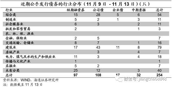 從主要發(fā)行品種來(lái)看,本周共發(fā)行短融超短融97只,中期票據(jù)32只,企業(yè)債發(fā)行17只,公司債發(fā)行108只,發(fā)行數(shù)量較前一個(gè)交易周增加。從發(fā)行人資質(zhì)來(lái)看,AAA等級(jí)發(fā)行人占比最大為49%。從行業(yè)來(lái)看,建筑行業(yè)發(fā)行人占比最大為31%,其次為綜合類行業(yè)發(fā)行人,占比為21%。在發(fā)行的254只主要品種信用債中有22只城投債,占比約8.7%,發(fā)行數(shù)量比前一周有所減少。
