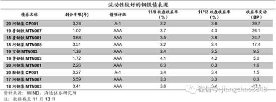 鋼鐵、采掘行業(yè)利差、超額利差走闊。具體來(lái)看,截至11月13日,AAA級(jí)鋼鐵債信用利差平均為114BP,較上周末上行19BP;AAA級(jí)采掘債(主要是煤炭開(kāi)采)信用利差平均為100BP,較上周末上行17BP;AAA級(jí)鋼鐵債超額利差為34BP,較上周末上行6BP;AAA級(jí)采掘債超額利差為20BP,較上周末上行4BP。