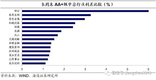 中等級(jí)債券中,綜合類行業(yè)利差最高,其次為醫(yī)藥生物和有色金屬行業(yè),AA+等級(jí)綜合類及醫(yī)藥生物行業(yè)利差均在300BP以上。此外,機(jī)械設(shè)備、傳媒和采掘行業(yè)利差也相對(duì)較高。食品飲料行業(yè)利差水平相對(duì)最低,為111BP,和綜合類行業(yè)信用利差相差約590BP。