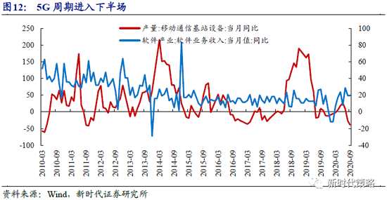 另一方面,5G周期正在進入下半場。從最近的數(shù)據(jù)來看,軟件產(chǎn)業(yè)業(yè)務收入增速在上升,已經(jīng)處于近5年中的較高水平,而移動通信基站設備產(chǎn)量增速不斷下降,已跌至2012年以來的新低。我們認為這主要源于5G基建的高峰(分析師)已過,而5G應用的需求卻剛剛開始放量,“路”修好后,接下來就是“通車”。所以軟件收入和基站設備產(chǎn)量增速之間表現(xiàn)出了背離的“喇叭口”。而同樣的情形也出現(xiàn)在了2014年下半年-2017年,時間上看也剛好是上一輪4G周期。所以成長股方面,除了應用非常廣泛的半導體之外,5G周期的演變進程值得重點關注。