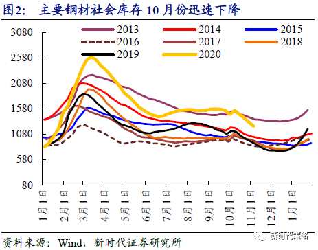 從具體數(shù)據(jù)來看,由于復工復產(chǎn)的持續(xù)推進,工業(yè)生產(chǎn)非常旺盛,粗鋼產(chǎn)量增速自疫情后持續(xù)回升,目前已接近近5年來的高點;受工業(yè)需求旺盛的影響,國內(nèi)主要鋼材的社會庫存水平自10月以來迅速下降,且下降的斜率較往年更大。