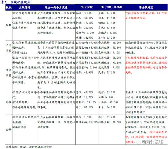 配置主線探討:當前時點與之前一個季度相比,對風格影響最大的變化在于:(1)盡管地產(chǎn)和基建“不太給力”,但工業(yè)生產(chǎn)和消費需求很旺盛,經(jīng)濟的內(nèi)生動能正在被激發(fā),復蘇正擴散到可選消費領域。(2)海外訂單回流為部分長時間處于周期低谷的行業(yè)帶來了新的增量需求,在淡季展現(xiàn)出了異常的繁榮。一方面國內(nèi)龍頭公司憑借技術和產(chǎn)能優(yōu)勢將會收獲更多的訂單和利潤,龍頭價值風格將會繼續(xù)強化并擴散。另一方面部分上游行業(yè)已經(jīng)出現(xiàn)庫存驟降的現(xiàn)象,我們認為這是下游需求旺盛的征兆。由此帶來的補庫效應疊加龍頭的產(chǎn)能周期,將大概率帶來經(jīng)濟年度級別的周期回升。(3)外資和公募等兩類大資金不約而同地開始按照經(jīng)濟復蘇的脈絡做配置和布局。從上述三個方面來看,再結合各行業(yè)的估值情況,我們認為金融周期的比較優(yōu)勢較為明顯,在臨近年末的當下將會有更高的勝率。考慮到過去兩年投資者對金融周期的預期壓制得非常低,我們認為一旦基本面確認反轉,ROE拐點出現(xiàn),將會出現(xiàn)絕佳的反身性機會,可能會形成1-2個季度領漲的戴維斯雙擊行情。