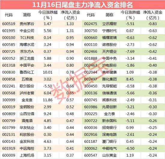 從個(gè)股尾盤資金流向數(shù)據(jù)看,有13股尾盤凈流入資金超過5000萬元,貴州茅臺(tái)、中金公司、TCL科技等個(gè)股尾盤資金凈流入金額最多,分別高達(dá)1.33億元、1.31億元、0.95億元;立訊精密、寧德時(shí)代、福耀玻璃等個(gè)股尾盤資金凈流出金額最多。