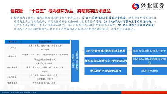 慢變量:供給側(cè) VS 需求側(cè),隱性 VS 顯性,內(nèi)循環(huán)激發(fā)農(nóng)村消費(fèi)群體、提升數(shù)字經(jīng)濟(jì)比重、突破高端技術(shù)壁壘,把握相關(guān)產(chǎn)業(yè)方向投資機(jī)會(huì)。