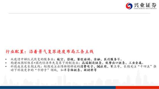 行業(yè)配置:沿著景氣復(fù)蘇布局三條主線——復(fù)蘇服務(wù)業(yè)、優(yōu)勢(shì)制造及出口鏈、科技成長(zhǎng)主線