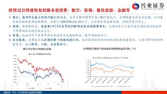 從疫情中梯隊(duì)式恢復(fù)的服務(wù)業(yè):航空、影視、餐飲旅游、金融、醫(yī)療服務(wù)等。從盈利彈性角度,關(guān)注:1)受益于飛機(jī)供給增速收縮+航司集中度提升+時(shí)刻供給結(jié)構(gòu)優(yōu)化的航空,航運(yùn)也有類似邏輯。2)在限流的背景下國(guó)慶檔期仍實(shí)現(xiàn)近40億票房收入的影院。3)恢復(fù)趨勢(shì)明顯提速疊加消費(fèi)回流的景區(qū)和演藝。4)盈利沖擊最大時(shí)段可能已經(jīng)過去并且估值修復(fù)空間大的銀行;疫情解除后低基數(shù)+開門紅以及受益于長(zhǎng)端利率上行的保險(xiǎn)。5)受帶量采購(gòu)影響較小的醫(yī)療服務(wù)。