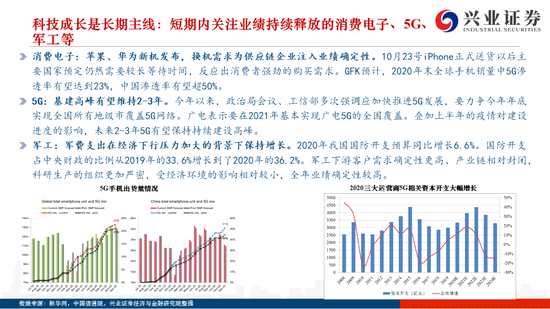 科技成長(zhǎng)是長(zhǎng)期主線。頂層設(shè)計(jì)+高質(zhì)量發(fā)展需求驅(qū)動(dòng)+降低融資難度,多因素推動(dòng)科技成長(zhǎng)進(jìn)入長(zhǎng)期向上通道。短期關(guān)注業(yè)績(jī)持續(xù)釋放的消費(fèi)電子、5G應(yīng)用、軍工等,中長(zhǎng)期關(guān)注“十四五”推動(dòng)下“卡脖子”環(huán)節(jié)的國(guó)產(chǎn)替代,如半導(dǎo)體鏈條、新材料等。