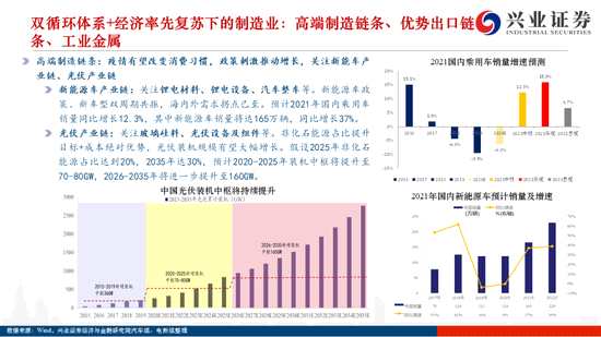 構(gòu)建雙循環(huán)體系+國(guó)內(nèi)經(jīng)濟(jì)率先復(fù)蘇下的制造業(yè):高端制造鏈條、優(yōu)勢(shì)出口鏈條、工業(yè)金屬。構(gòu)建雙循環(huán)體系需要內(nèi)部和外部、制造和需求共同發(fā)力。隨著國(guó)內(nèi)經(jīng)濟(jì)率先恢復(fù),國(guó)內(nèi)優(yōu)勢(shì)制造業(yè)龍頭一方面受國(guó)內(nèi)需求回暖帶動(dòng),另一方面切入海外供應(yīng)鏈占領(lǐng)全球份額。1)高端制造領(lǐng)域,關(guān)注新能源車及光伏產(chǎn)業(yè)鏈。新能源車政策、新車型雙周期共振,海內(nèi)外需求拐點(diǎn)已至,關(guān)注鋰電材料、鋰電設(shè)備、汽車整車等。非化石能源占比提升+成本絕對(duì)優(yōu)勢(shì),光伏裝機(jī)規(guī)模有望大幅增長(zhǎng),關(guān)注玻璃硅料、光伏設(shè)備及組件等。2)全球經(jīng)濟(jì)恢復(fù)疊加疫情仍未消退,國(guó)內(nèi)出口優(yōu)勢(shì)企業(yè)持續(xù)收獲訂單,過去幾年低需求下供給側(cè)持續(xù)優(yōu)化,關(guān)注化工、輕工、家電、機(jī)械及器械等3)經(jīng)濟(jì)恢復(fù)帶動(dòng)制造業(yè)持續(xù)復(fù)蘇,疊加國(guó)外潛在的大規(guī)模刺激政策,工業(yè)金屬價(jià)格有望持續(xù)上行,關(guān)注銅、鋁。