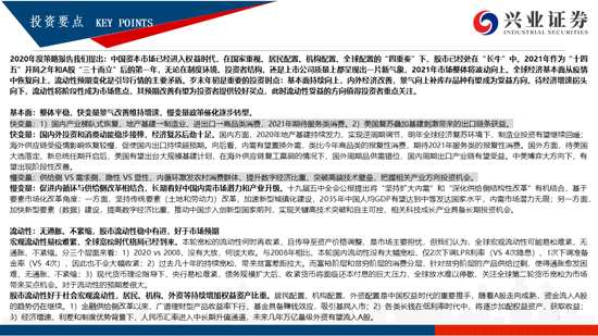 2020年度策略報(bào)告我們提出:中國(guó)資本市場(chǎng)已經(jīng)進(jìn)入權(quán)益時(shí)代,在國(guó)家重視、居民配置、機(jī)構(gòu)配置、全球配置的“四重奏”下,股市已經(jīng)處在“長(zhǎng)?!敝?。2021年作為“十四五”開局之年和A股“三十而立”后的第一年,無論在制度環(huán)境、投資者結(jié)構(gòu)、還是上市公司質(zhì)量上都呈現(xiàn)出一片新氣象,2021年市場(chǎng)整體將波動(dòng)向上。全球經(jīng)濟(jì)基本面從疫情中恢復(fù)向上,流動(dòng)性預(yù)期變化是引導(dǎo)行情的主要矛盾。歲末年初是重要的投資時(shí)點(diǎn):基本面持續(xù)向上,內(nèi)外經(jīng)濟(jì)改善,景氣向上補(bǔ)庫(kù)存品種有望成為受益方向。待經(jīng)濟(jì)增速拐頭向下,流動(dòng)性將階段性成為市場(chǎng)焦點(diǎn),其預(yù)期改善有望為投資者提供較好買點(diǎn),此時(shí)流動(dòng)性受益的方向值得投資者重點(diǎn)關(guān)注。