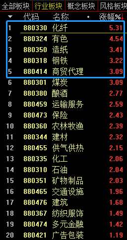 受10月經(jīng)濟(jì)數(shù)據(jù)繼續(xù)表現(xiàn)強(qiáng)勢(shì)、有色金屬等大宗商品價(jià)格集體上揚(yáng)等利多因素推動(dòng),今日有色、鋼鐵、煤炭、化工等周期股板塊,全面放量走強(qiáng)。截至今天收盤,通達(dá)信漲幅排名前20位的行業(yè)板塊,有多達(dá)一半來(lái)自于周期性行業(yè)。漲幅居前的包括化纖、有色、造紙、鋼鐵、煤炭等板塊。
