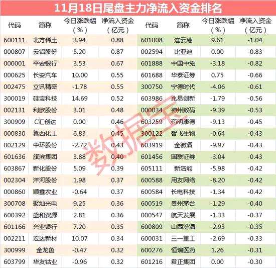 從個(gè)股尾盤資金流向數(shù)據(jù)看,有6股尾盤凈流入資金超過5000萬元,北方稀土、云鋁股份、平安銀行等個(gè)股尾盤資金凈流入金額最多,分別高達(dá)0.88億元、0.87億元、0.67億元;連云港、比亞迪、中國(guó)中免等個(gè)股尾盤資金凈流出金額最多。