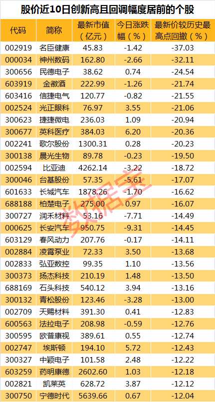 統(tǒng)計(jì),除去上市不滿3個(gè)月的次新股,在股價(jià)近10日創(chuàng)新高的個(gè)股中,47股最新價(jià)較最高點(diǎn)回撤超10%,這其中不乏歌爾股份、比亞迪、寧德時(shí)代等多只千億市值龍頭,歌爾股份最新價(jià)較近期高點(diǎn)已下跌超20%。