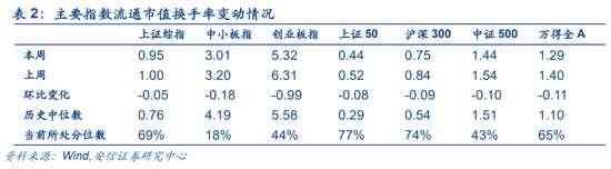 從換手率來看,本周主要指數(shù)換手率有所下降。本周上證綜指,中小板指,創(chuàng)業(yè)板指,上證50,滬深300,中證500,萬得全A的流通市值換手率分別為0.95%,3.01%,5.32%,0.44%,0.75%,1.44%,1.29%,分別較前周變動-0.05,-0.18,-0.99,-0.08,-0.09,-0.10,-0.11個百分點,分別處在69%,18%,44%,43%,74%,43%,56%分位數(shù)水平。