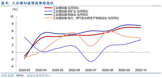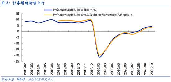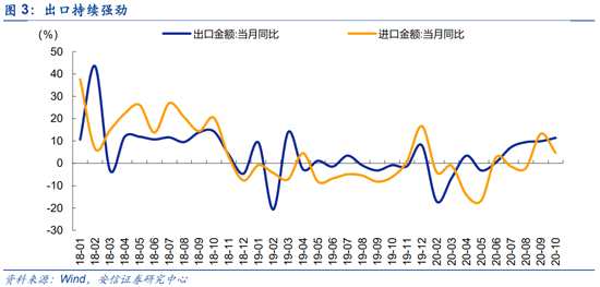 近期披露的中國十月經(jīng)濟數(shù)據(jù)顯示投資、消費、出口三駕馬車均動能強勁。10月固定資產(chǎn)投資完成額同比增速升至1.8%(9月為0.8%),房地產(chǎn)投資持續(xù)強勁、制造業(yè)投資快速回升。社會消費品零售總額當月同比10月再度走高,升至4.3%,除汽車以外社零同比增速升至3.6%。其中餐飲10月同比增長0.8%,為疫情以來首次轉(zhuǎn)正。而“銀十”期間汽車銷售依然火爆,中汽協(xié)數(shù)據(jù)顯示,10月汽車銷量同比增長12.49%,乘用車和商用車同比分別為9.25%和30.06%,汽車景氣上行周期進一步確認。10月出口同比增速甚至11.4%,創(chuàng)2019年3月以來新高,海外疫情惡化有望繼續(xù)帶來醫(yī)療物資、小家電、辦公用品、自行車等產(chǎn)品的大量訂單,同時中國良好的供應鏈狀態(tài)也有利于紡服、汽車零部件等產(chǎn)業(yè)鏈向中國轉(zhuǎn)移。人民幣匯率快速升值,美元兌人民幣離岸匯率已快速升至6.55,為2018年7月以來新高。
